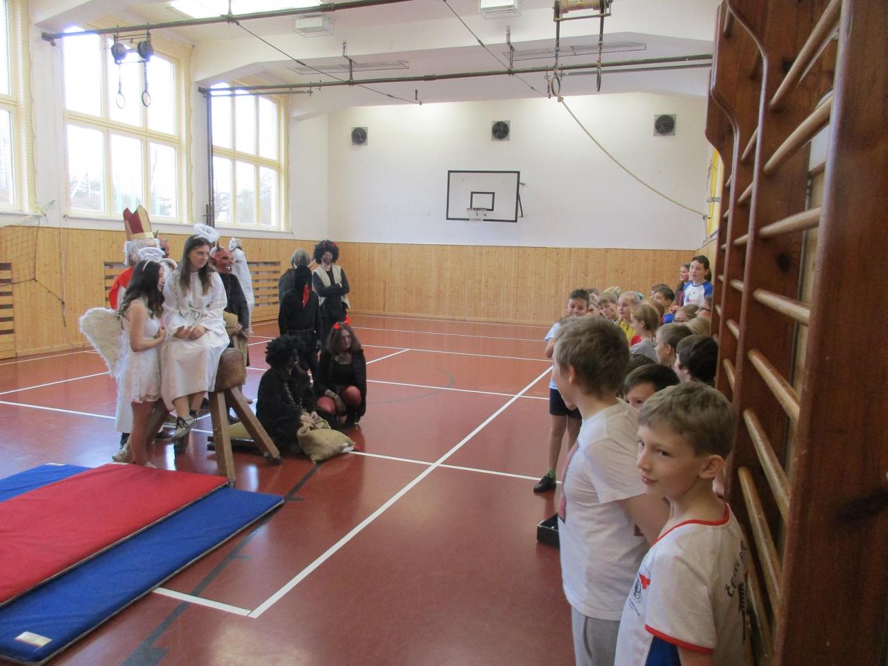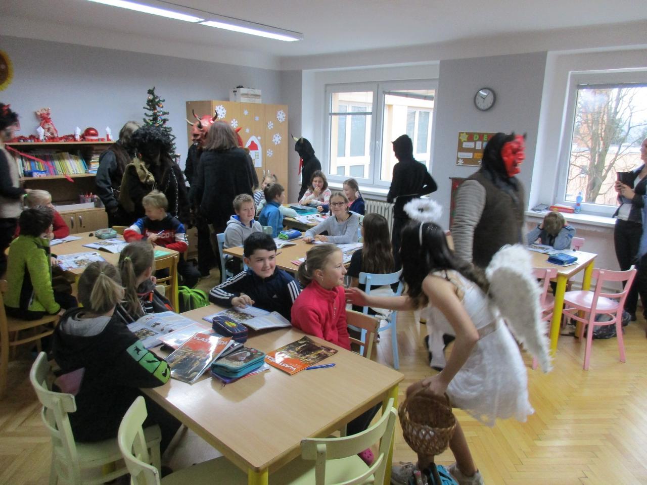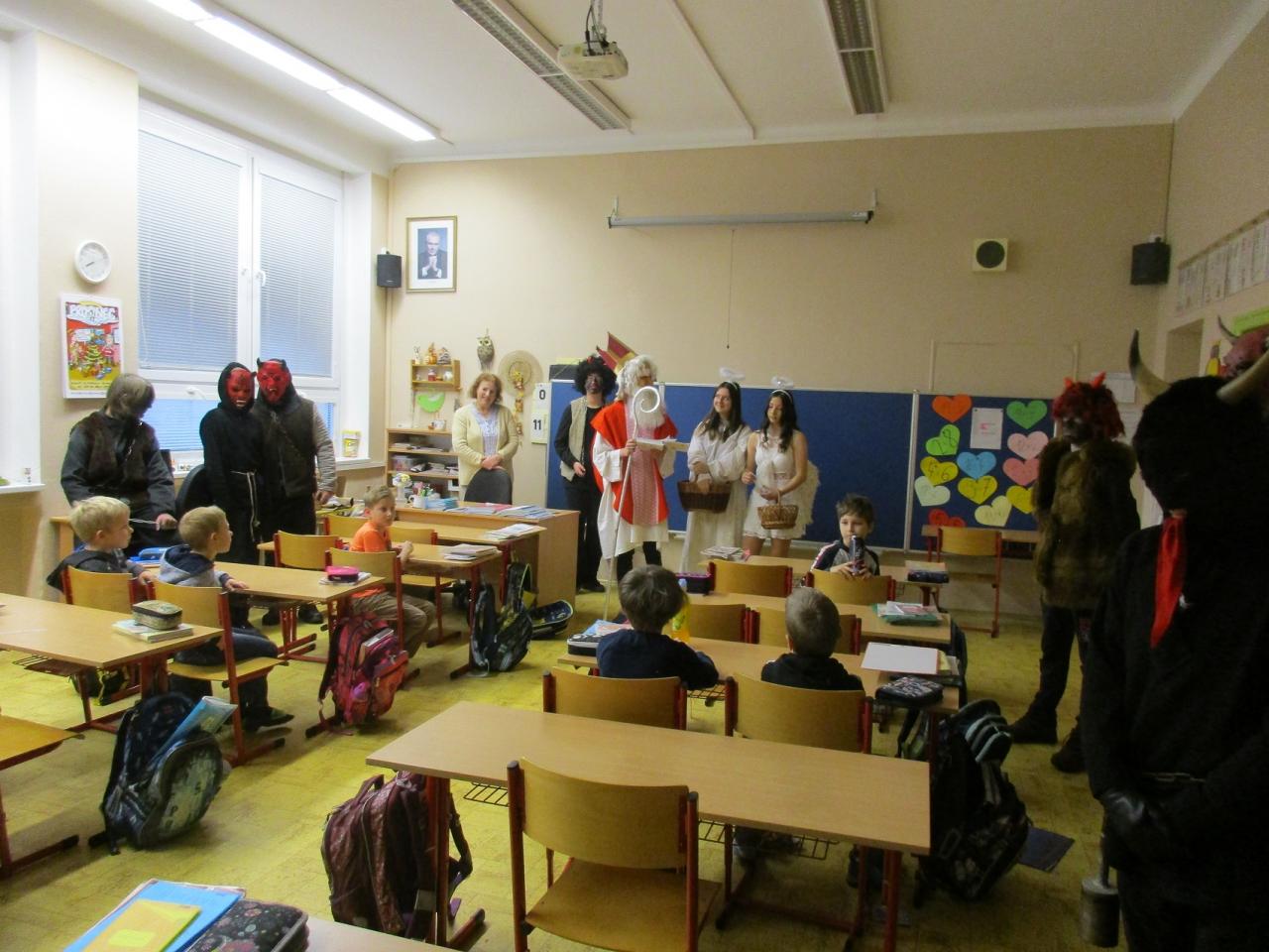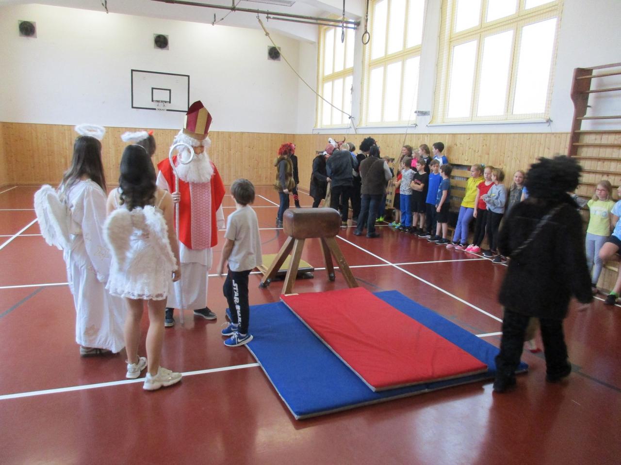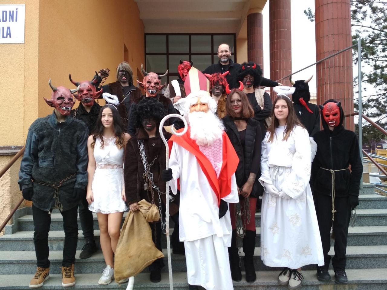 Tradiční Mikulášská obchůzka ve škole, kterou každým rokem připravují především pro mladší děti žáci 9. třídy.