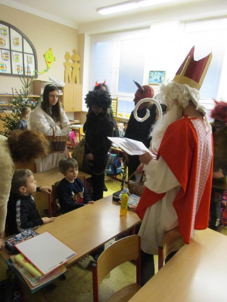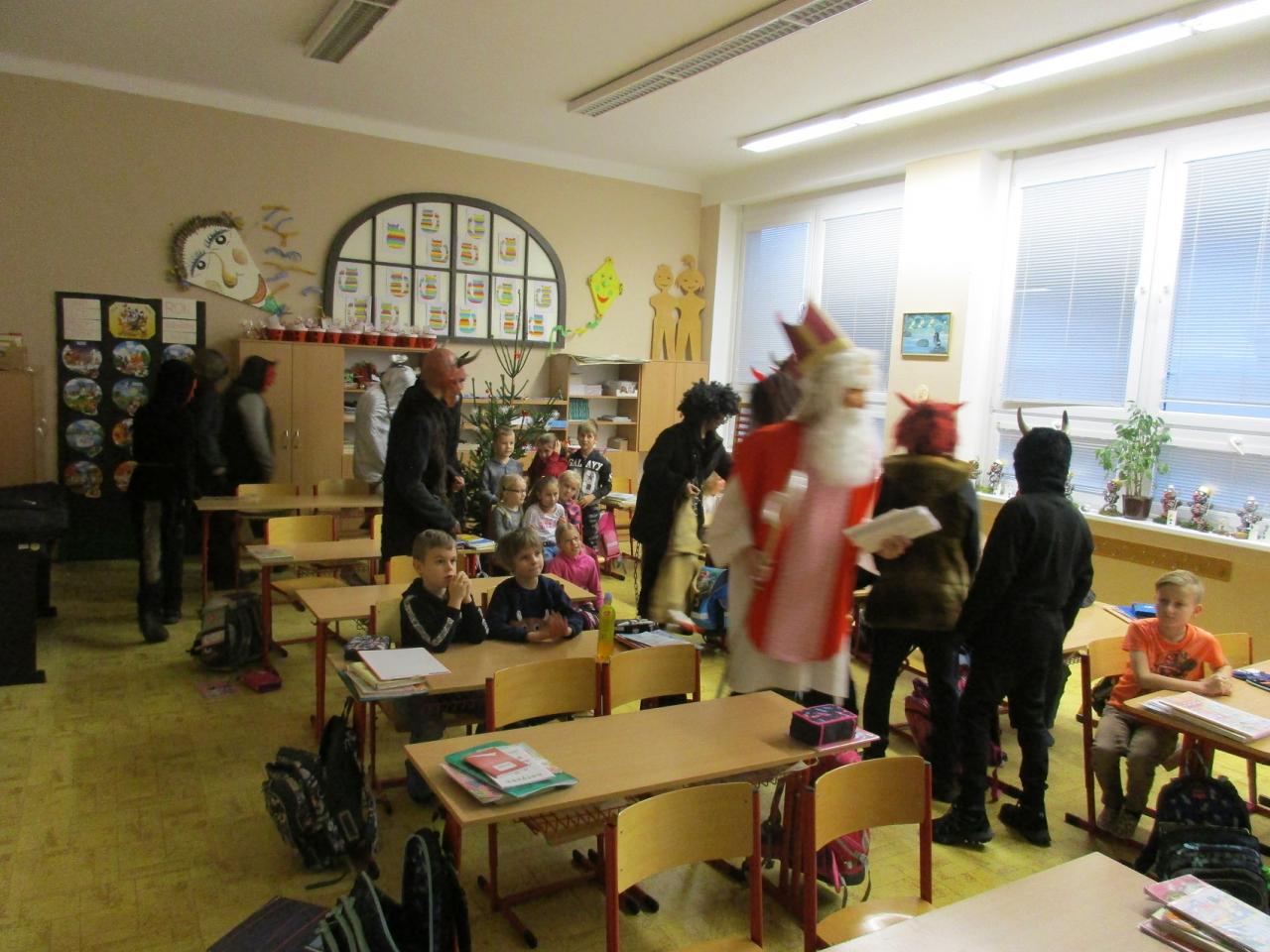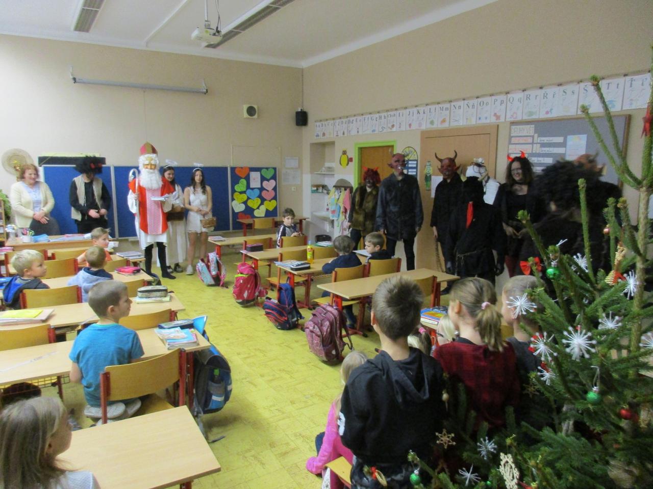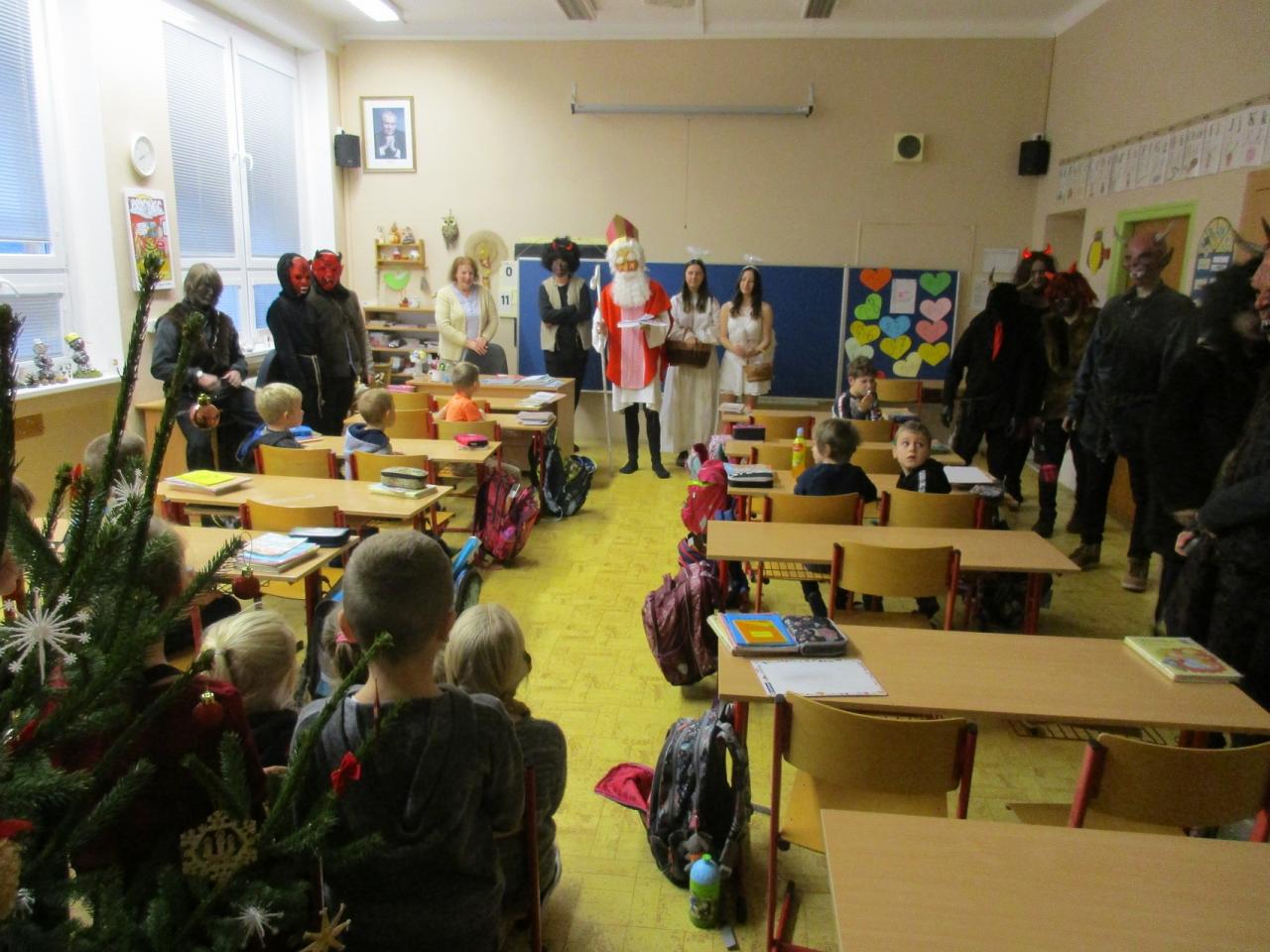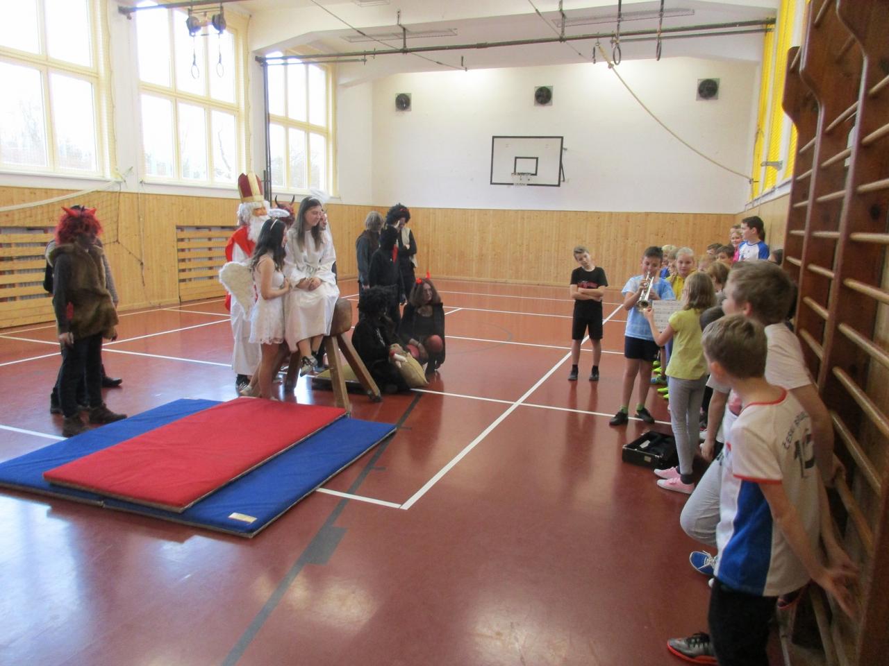Tradiční Mikulášská obchůzka ve škole, kterou každým rokem připravují především pro mladší děti žáci 9. třídy.