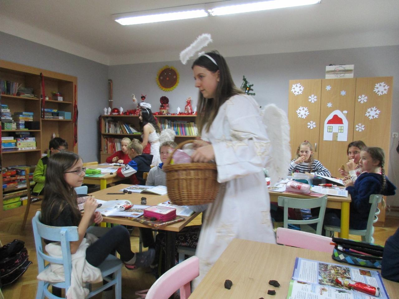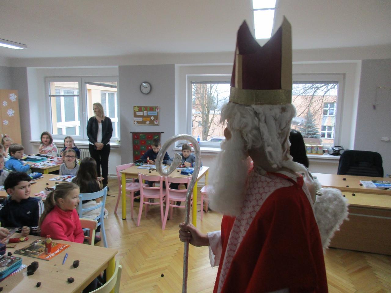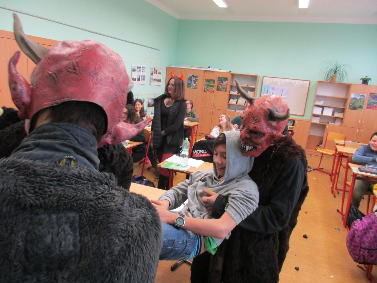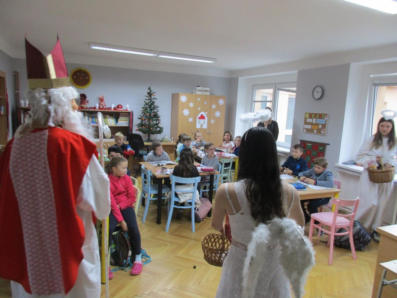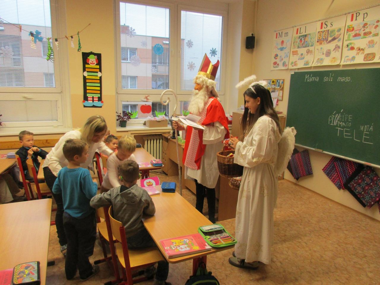 Tradiční Mikulášská obchůzka ve škole, kterou každým rokem připravují především pro mladší děti žáci 9. třídy.