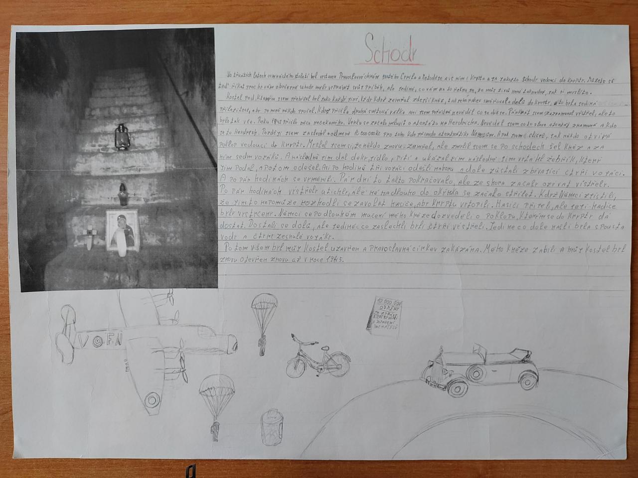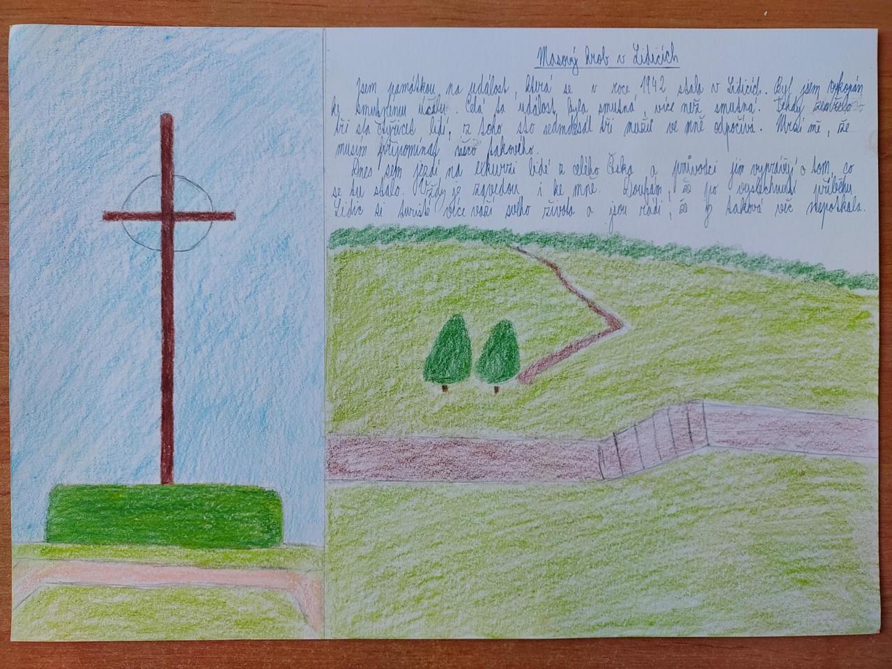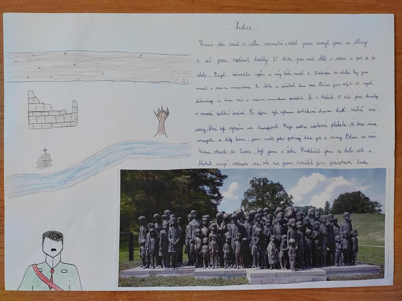 Žáci 8. třídy (spolu s 9. třídou) se zúčastnili exkurze po stopách atentátu na Heydricha. Při prohlídkách v Praze a v Lidicích si měli vyfotit něco, co je zaujalo. Ve škole pak k fotografii vytvořili příběh, který o výtvarné výchově doplnili vlastní ilustrací.