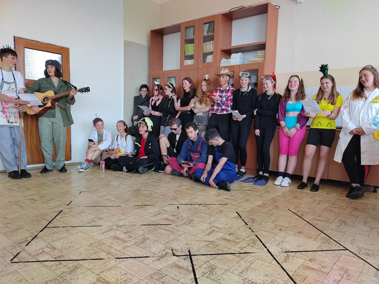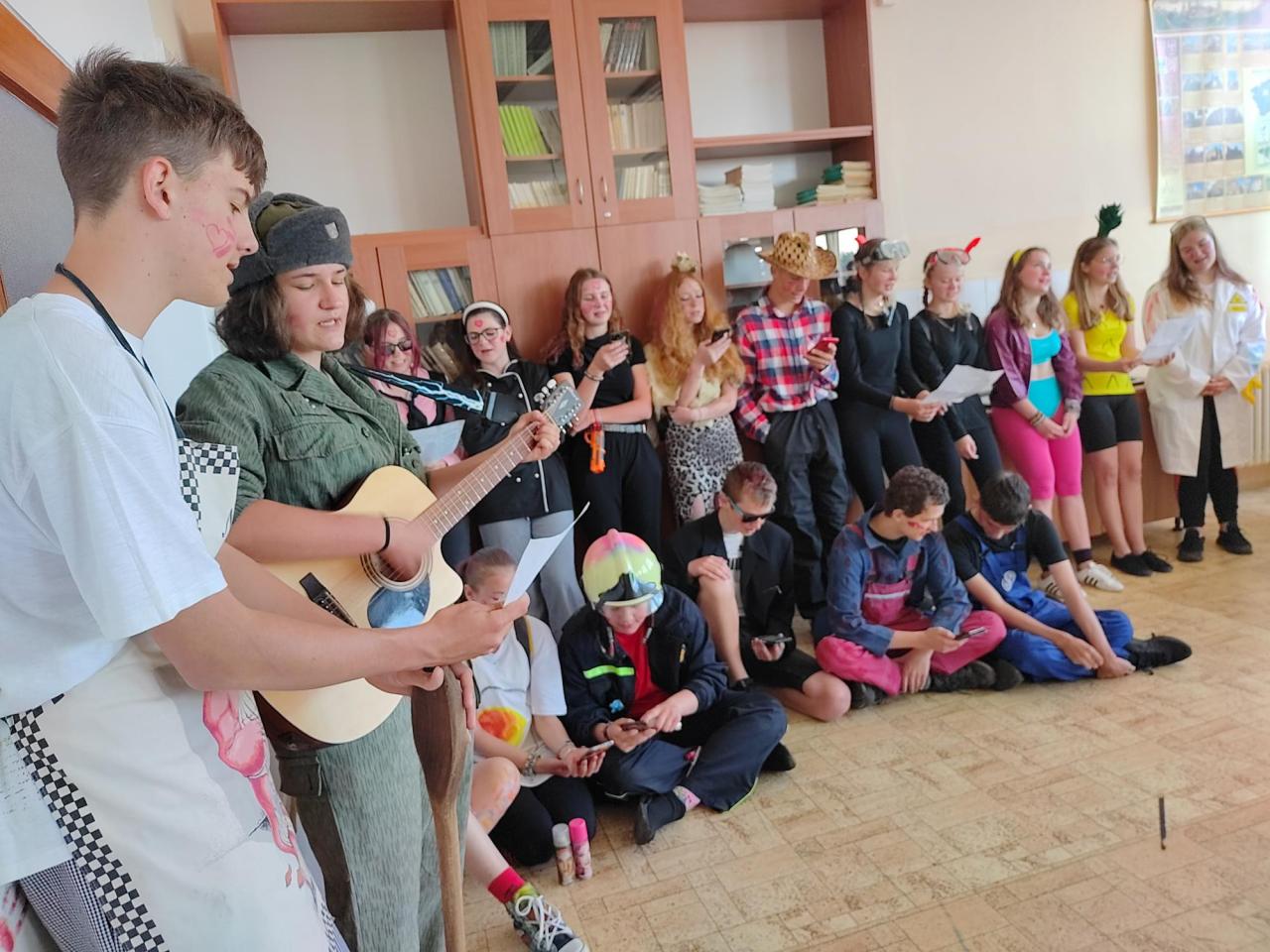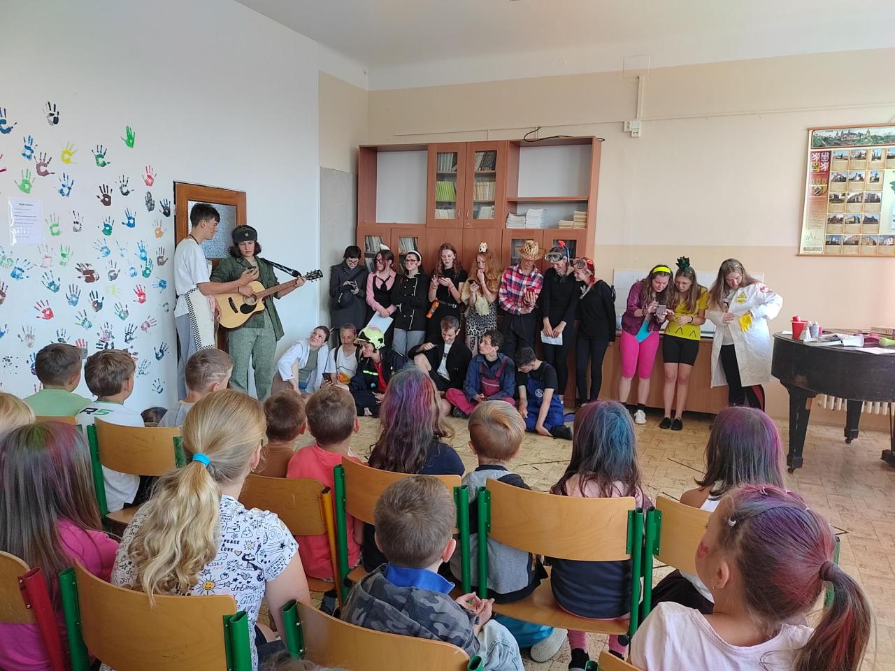 Deváťáci se koncem června loučili se základní školou. Svých devět let za ZŠ TŠ shrnuli v několika písničkách, které předvedli mladším spolužákům a zaměstnancům školy.