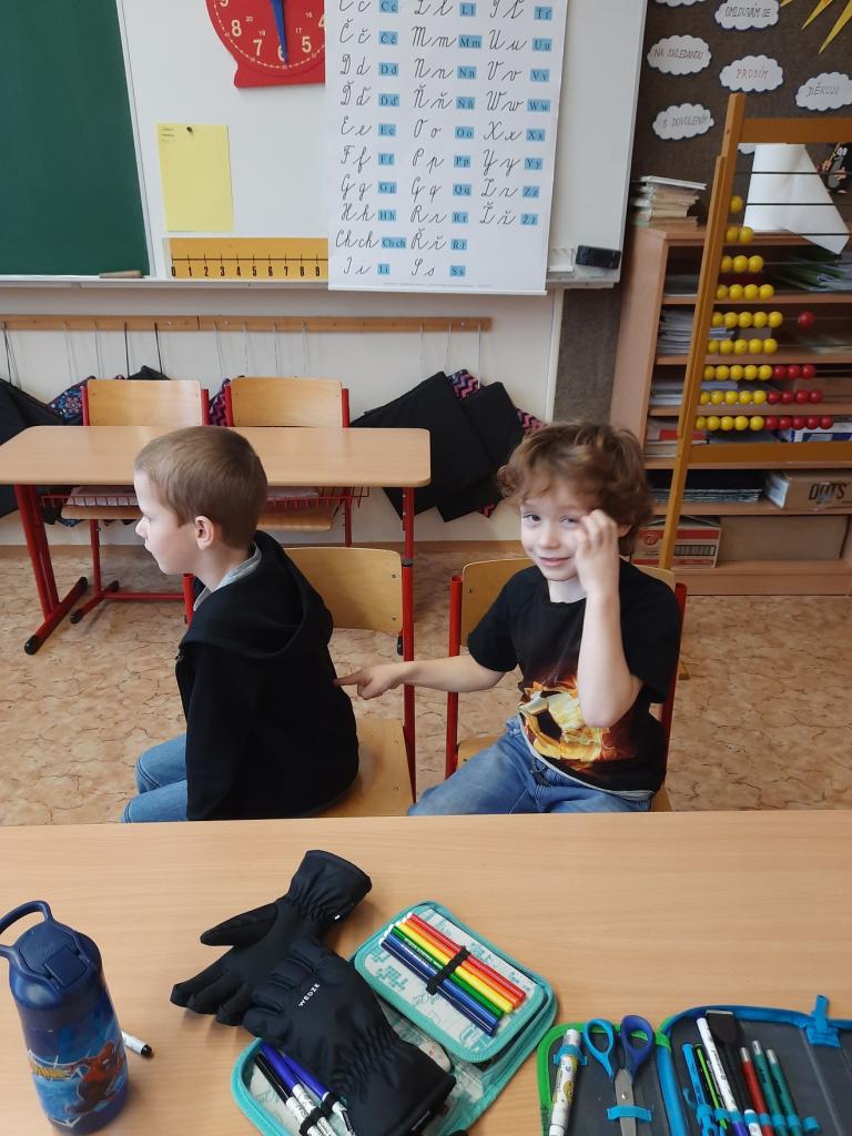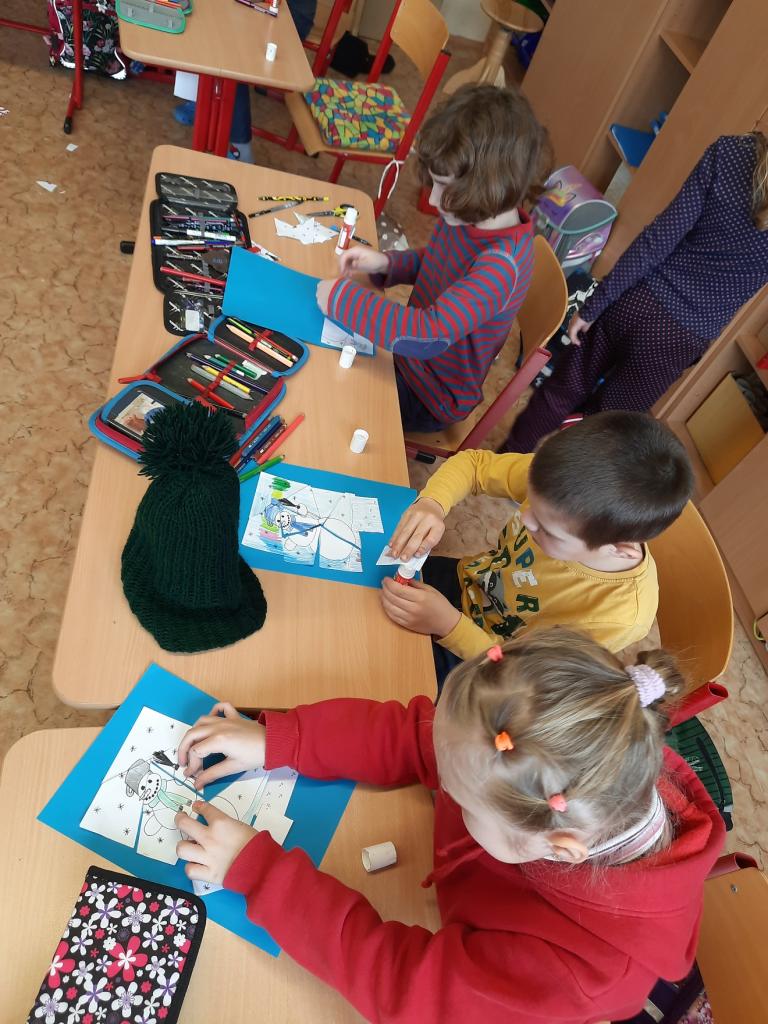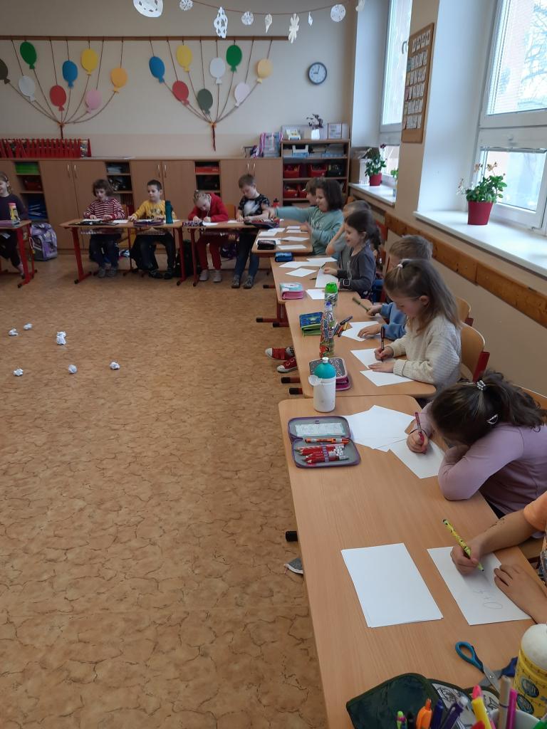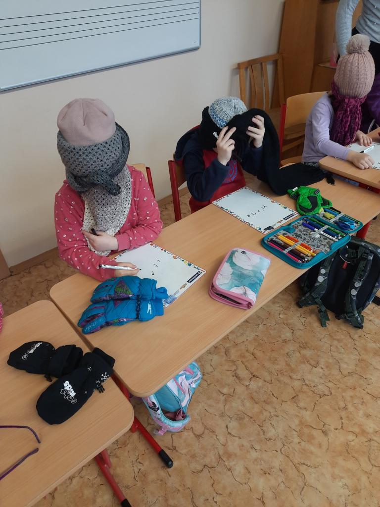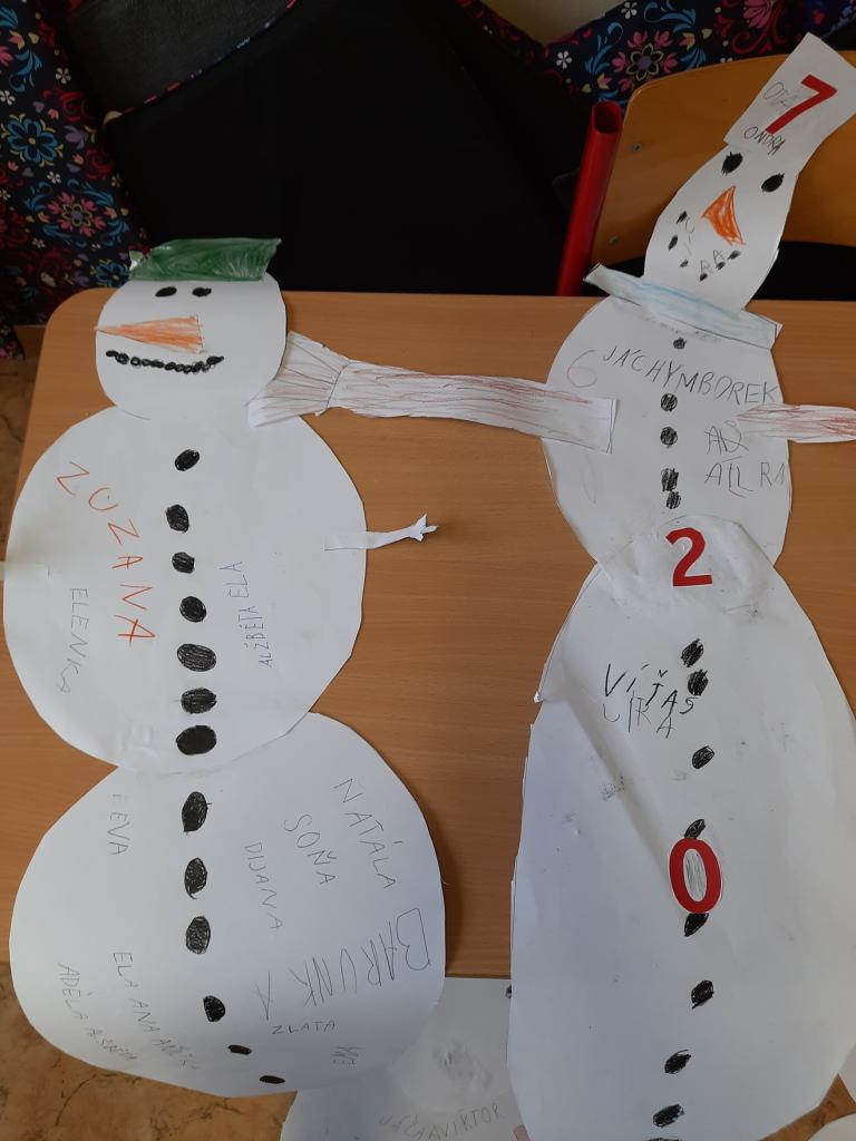 27.2. jsme si udělali zimu ve třídě a dokonce proběhla i „koulovačka“. V poledne stálo ve třídě 6 sněhuláků. Vyzkoušeli jsme si psaní poslepu, bez rukou. K tomu všemu jsme stihli i počítat „ledové příklady“ a rozdělit slova na slabiky, rozstříhali jsme a opět složili sněhuláka.