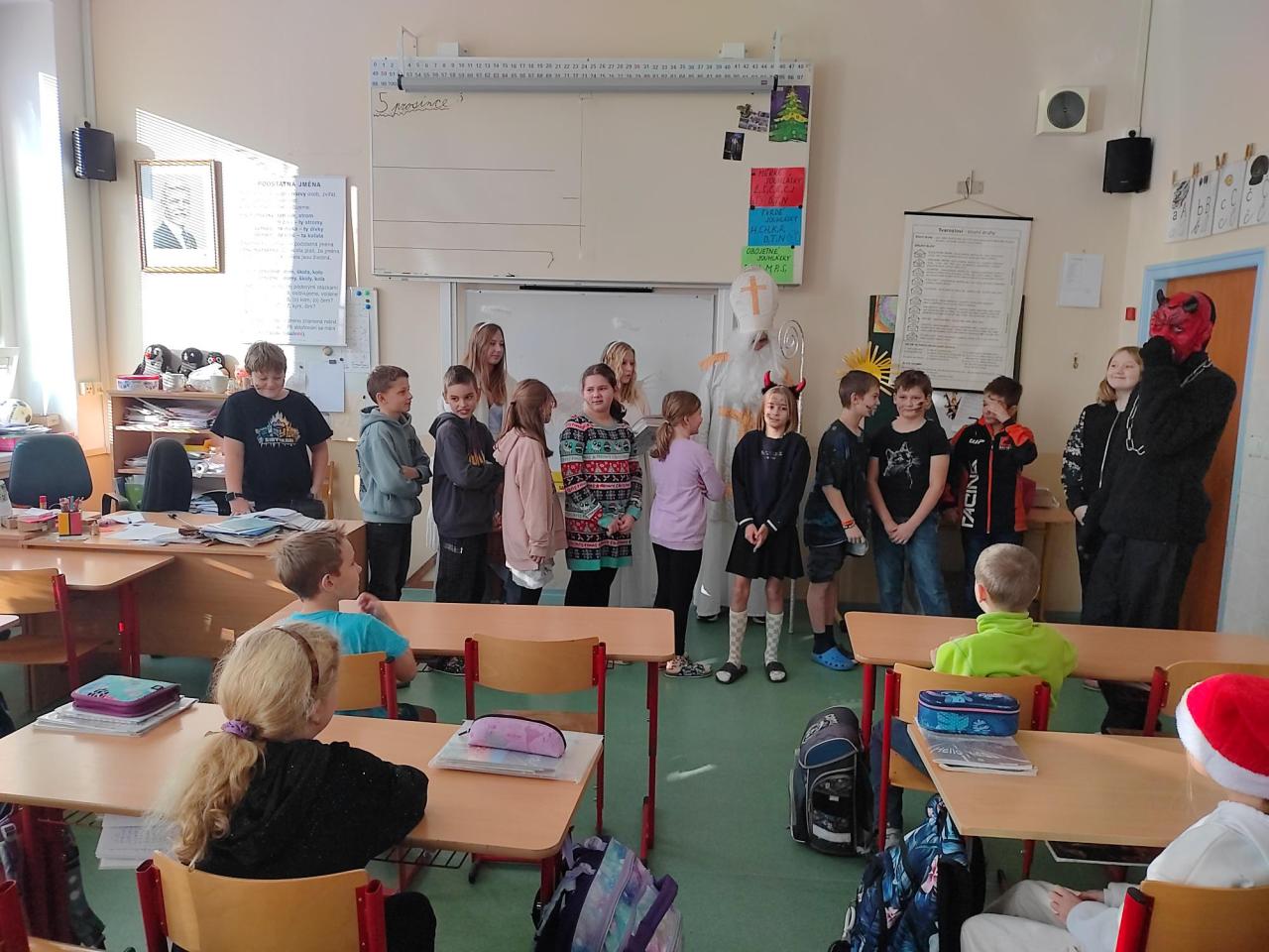 Dnes naši třídu navštívil Mikuláš se svojí družinou a dobře to dopadlo. Rohatí čerti nakonec nikoho neodnesli. Někteří žáci byli však řádně pokáráni a museli slíbit, že se napraví. Všichni nakonec dostali něco sladkého na zub.