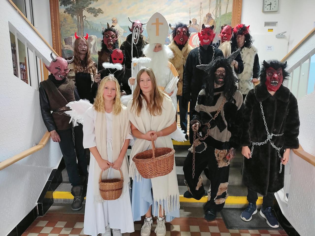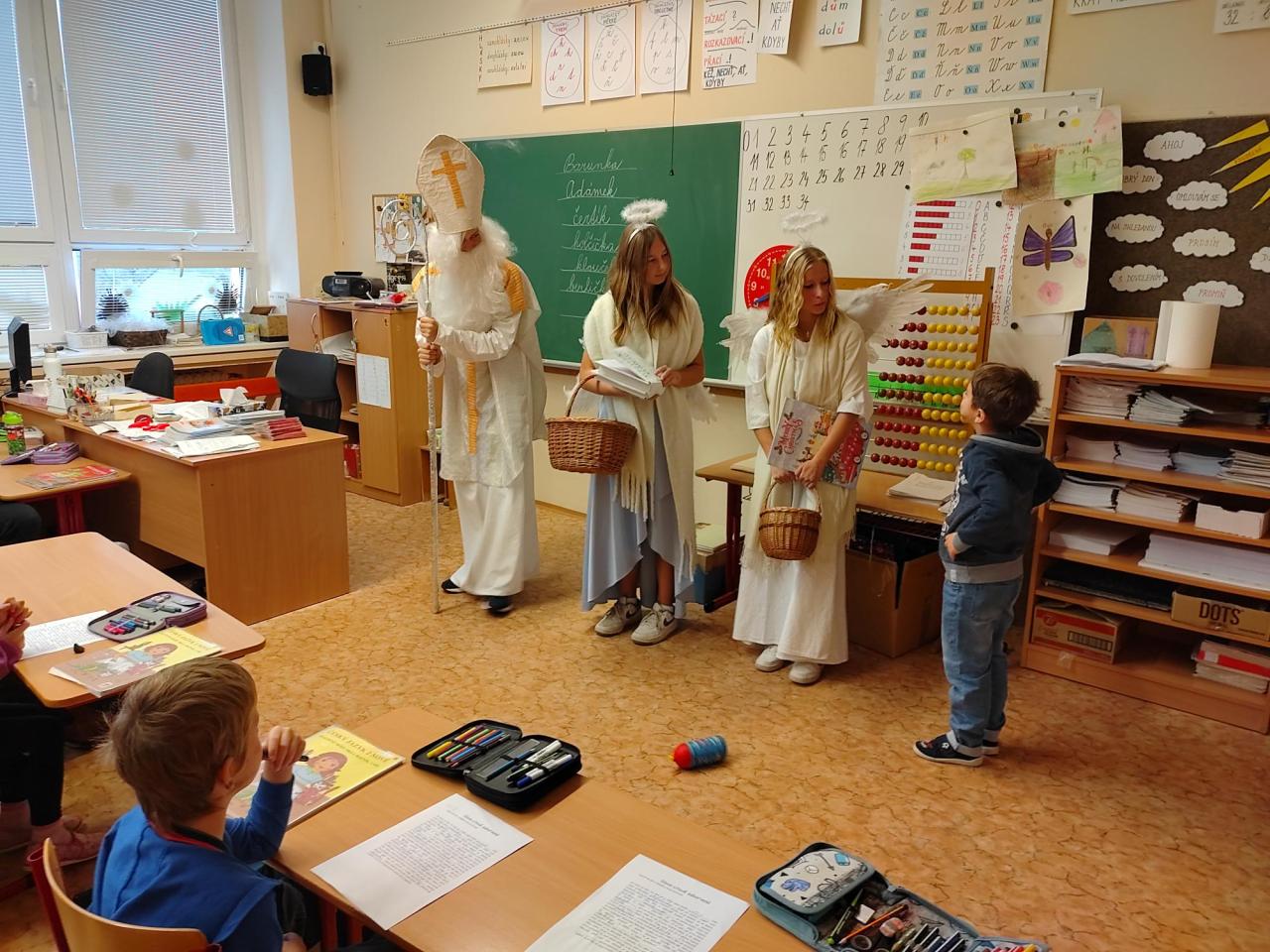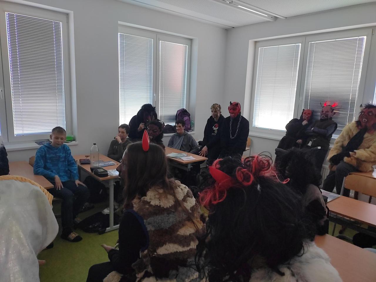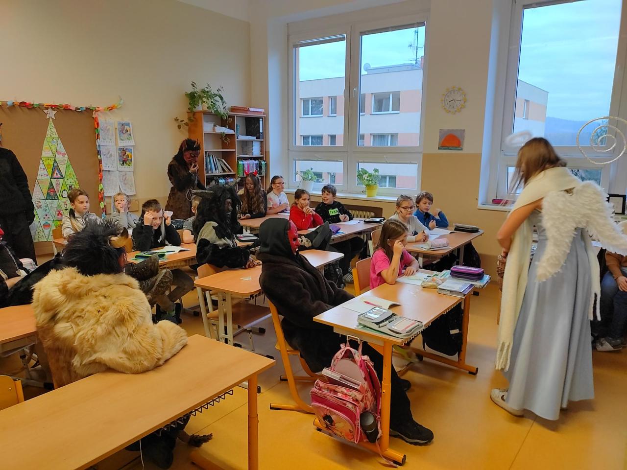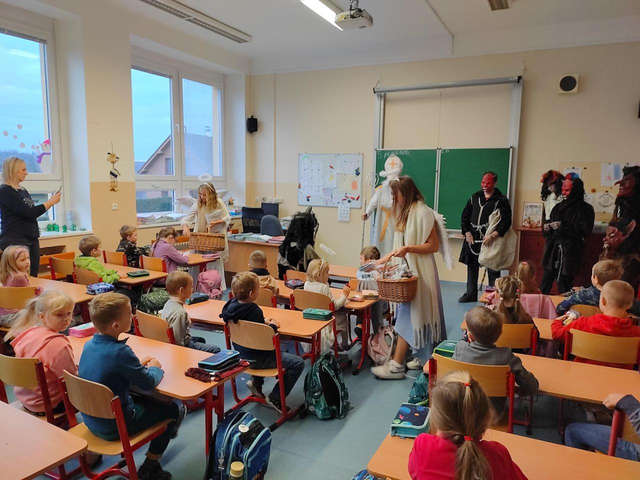 Ani letos nezapomněla Mikulášova družina na naši školu. Hned ráno se objevil v první třídě Mikuláš se svými pomocníky - dvěma anděli a neposednými čerty. Postupně prošla mikulášská družina celou školu a svou pouť zakončila u nejstarších žáků. Děkujeme žákům 9. třídy za přípravu Mikulášské obchůzky.