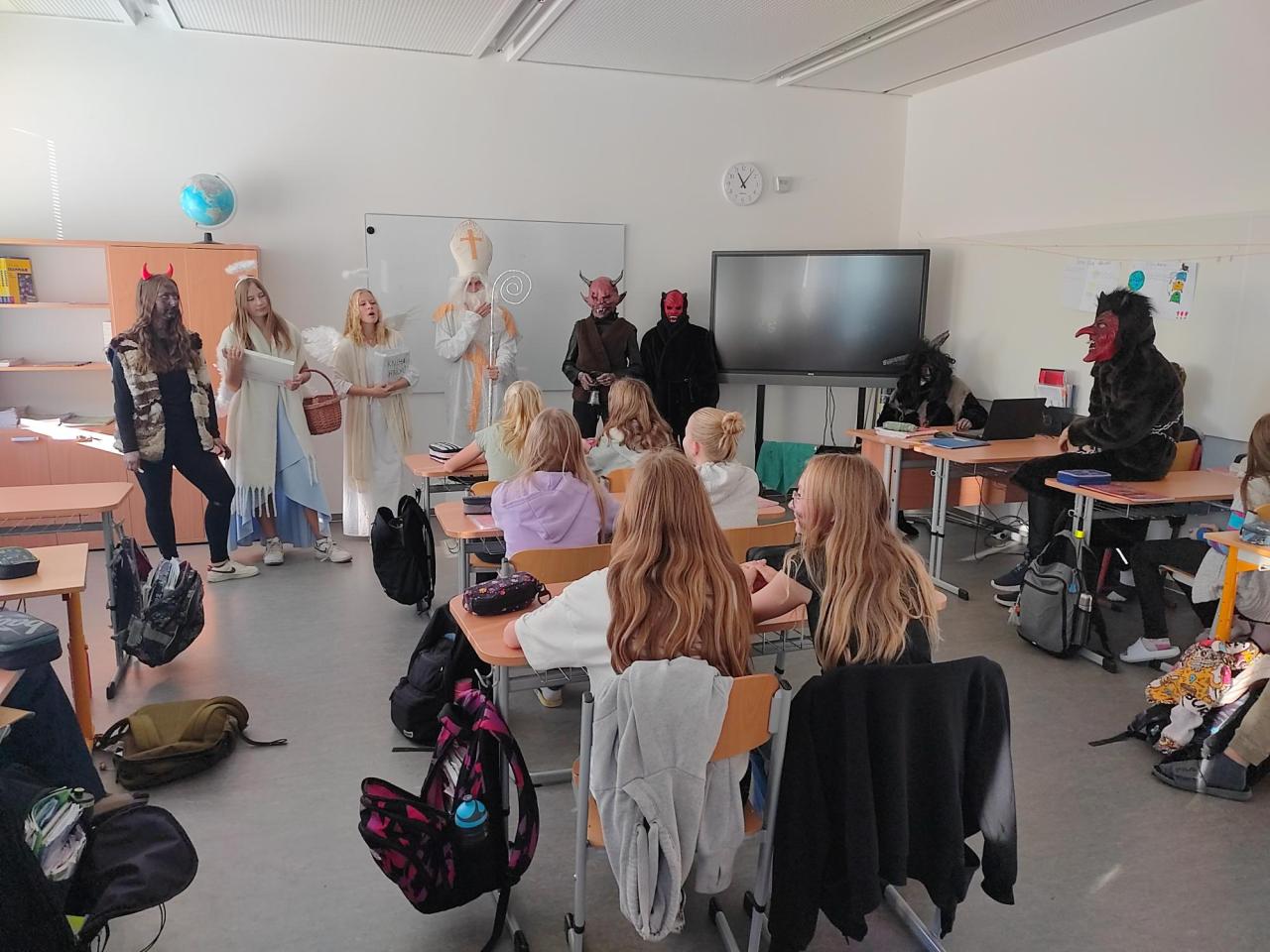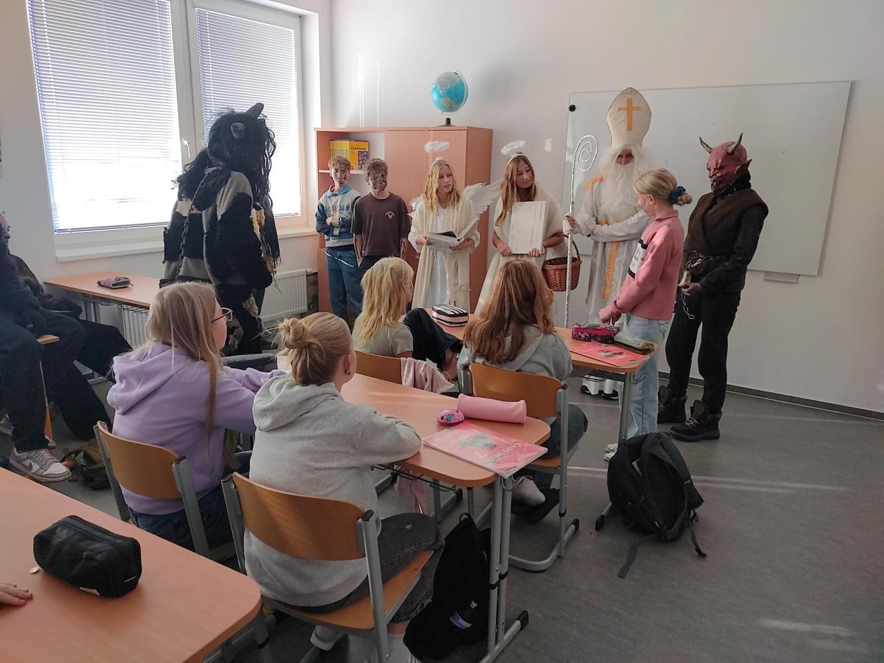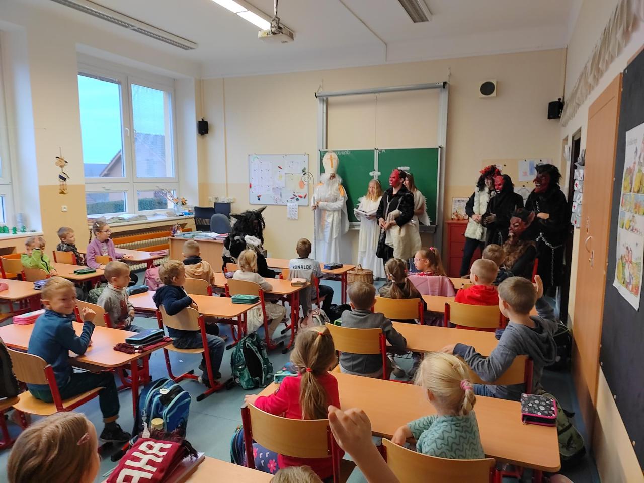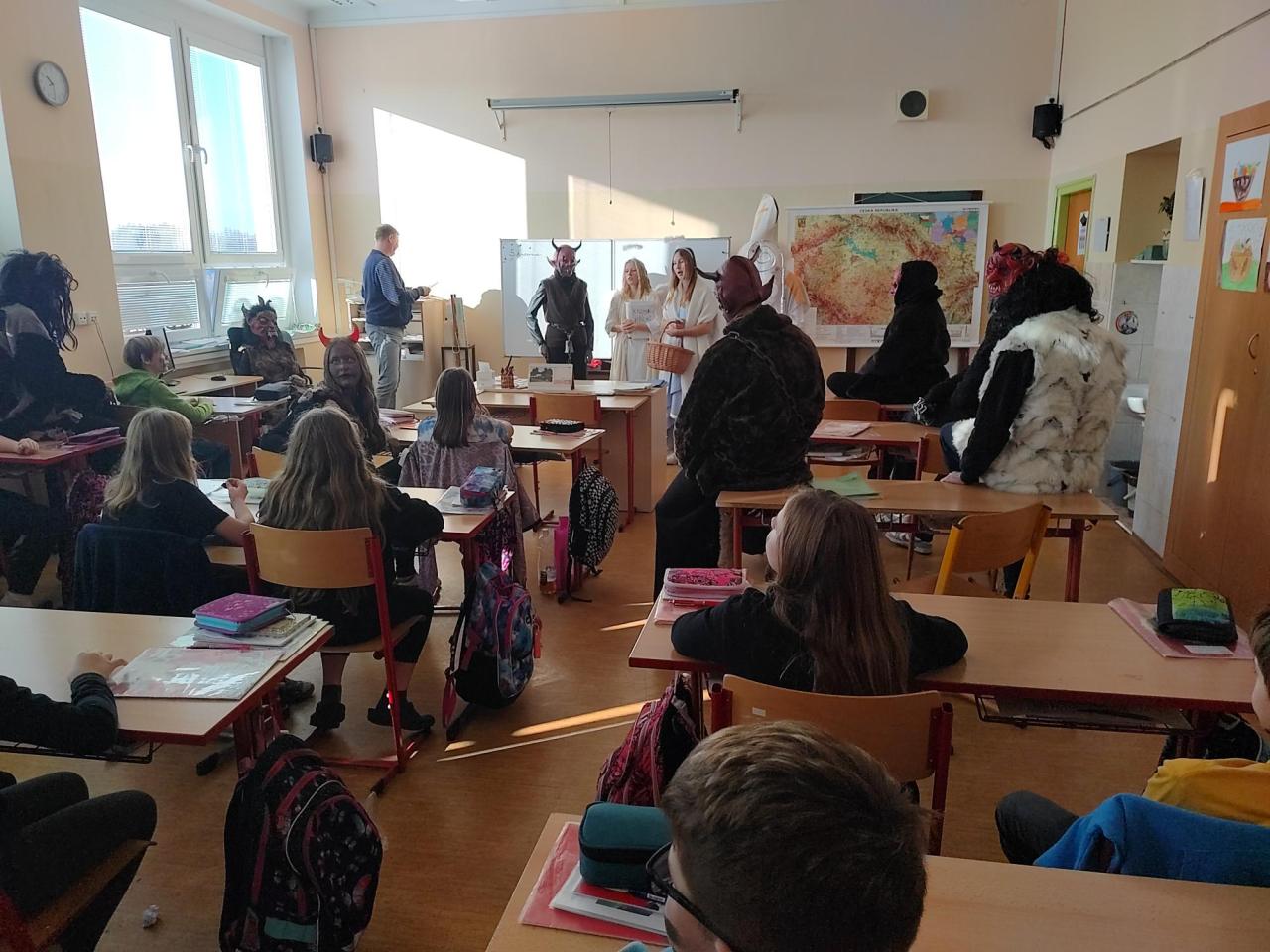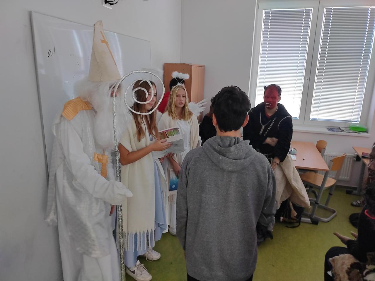 Ani letos nezapomněla Mikulášova družina na naši školu. Hned ráno se objevil v první třídě Mikuláš se svými pomocníky - dvěma anděli a neposednými čerty. Postupně prošla mikulášská družina celou školu a svou pouť zakončila u nejstarších žáků. Děkujeme žákům 9. třídy za přípravu Mikulášské obchůzky.