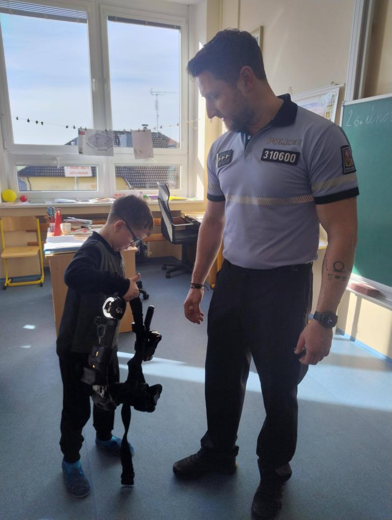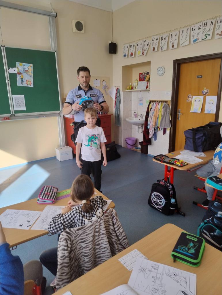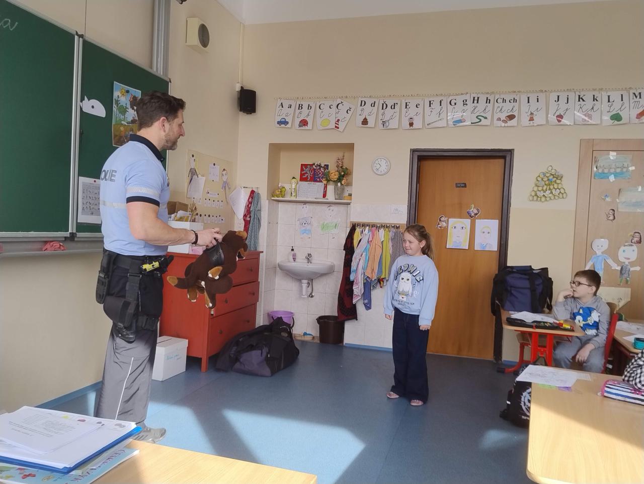 Koncem února navštívil naši třídu policista pan Bican, který nás seznámil s prací policie. Dozvěděli jsme se něco z dopravní výchovy, jak se chovat při setkání s neznámým člověkem nebo jak zacházet s nálezem nebezpečných předmětů. Na závěr jsme se pobavili při práci s Poldovými omalovánkami.