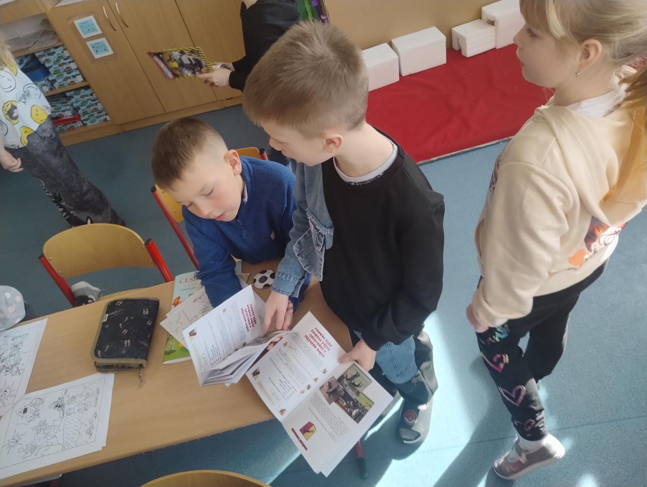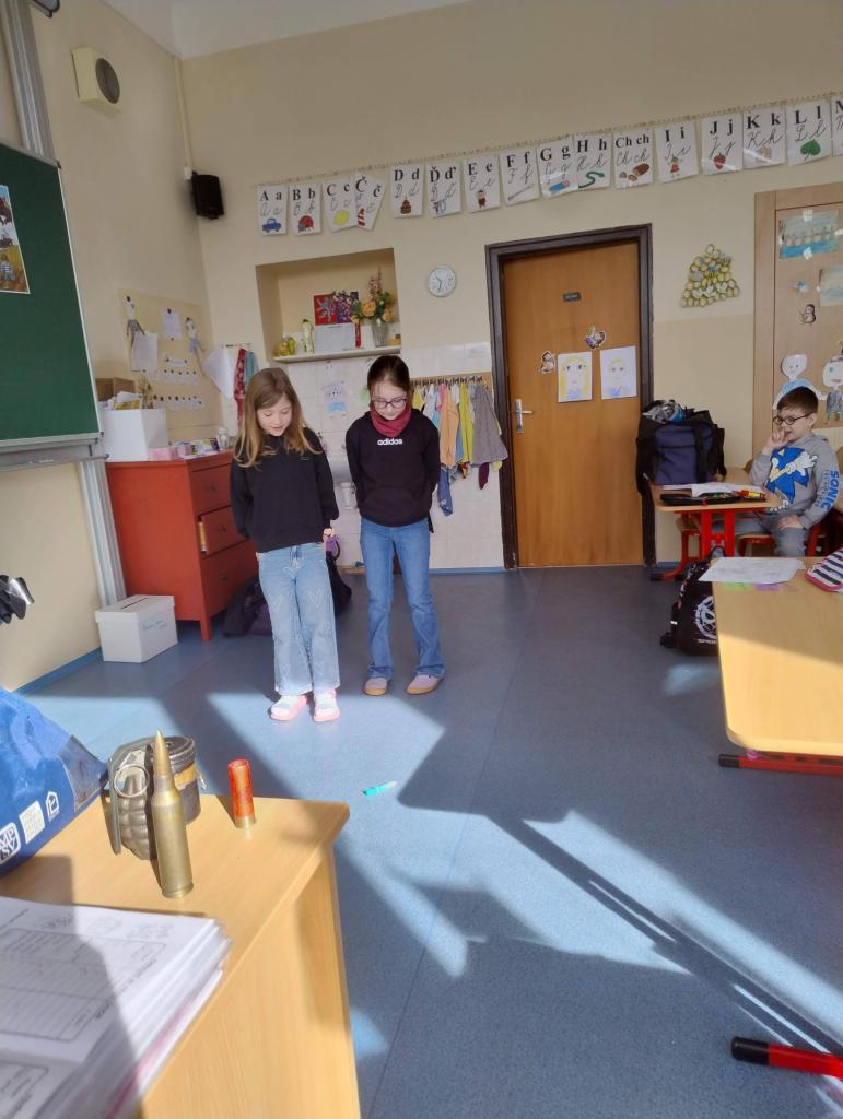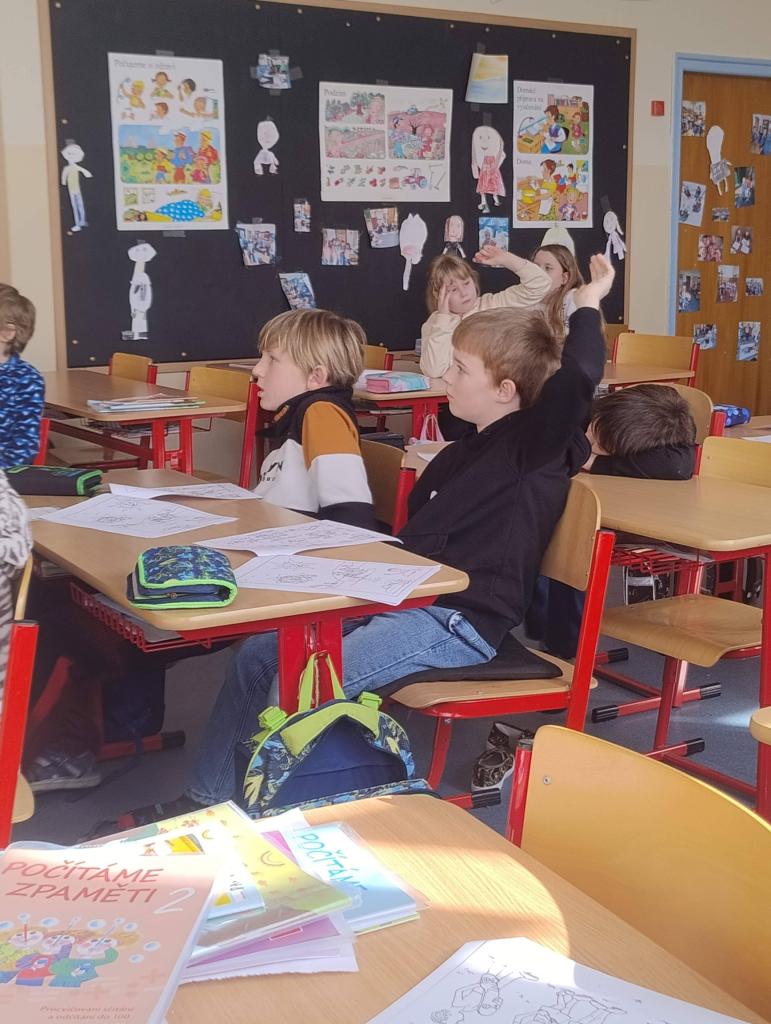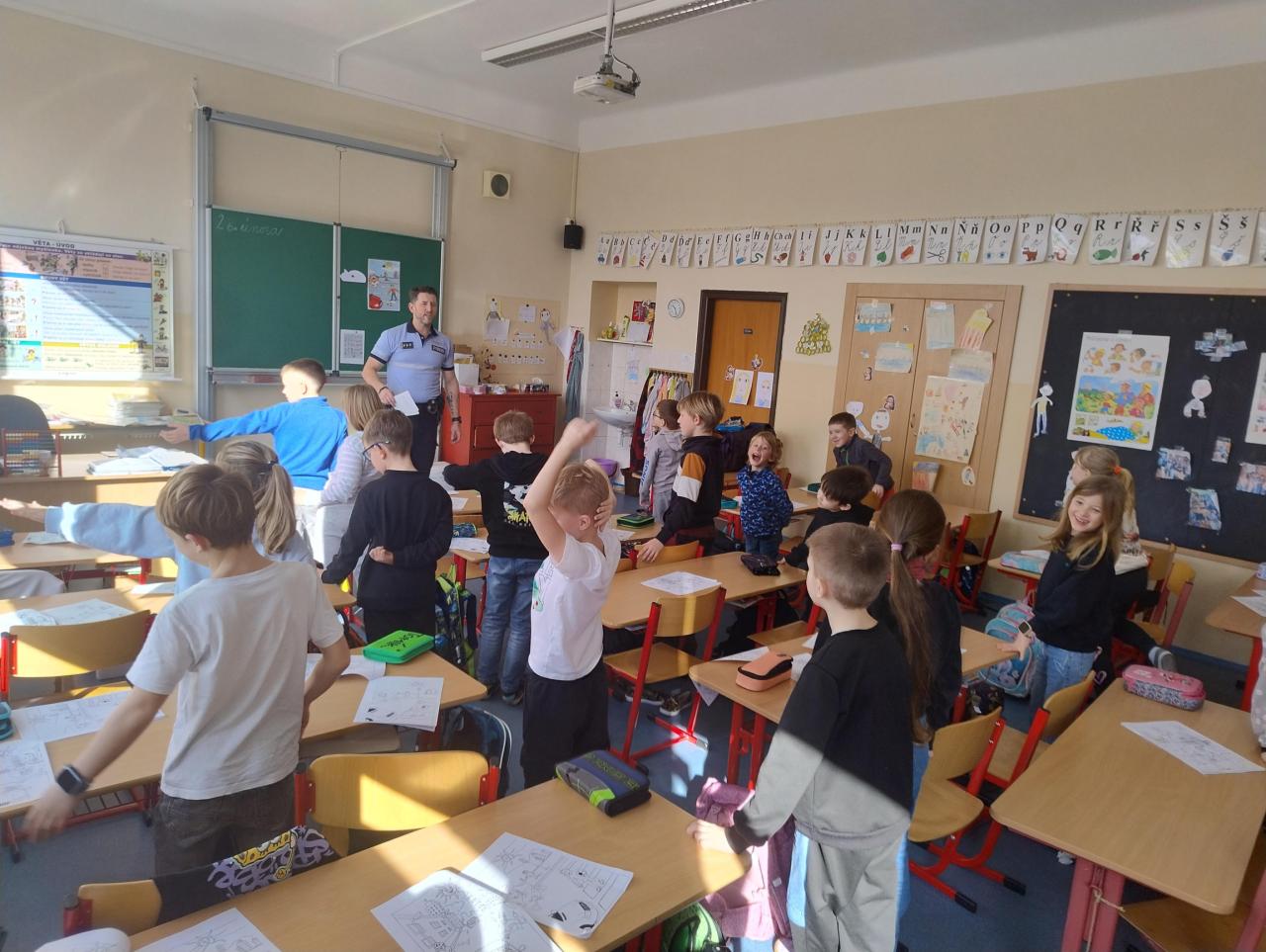 Koncem února navštívil naši třídu policista pan Bican, který nás seznámil s prací policie. Dozvěděli jsme se něco z dopravní výchovy, jak se chovat při setkání s neznámým člověkem nebo jak zacházet s nálezem nebezpečných předmětů. Na závěr jsme se pobavili při práci s Poldovými omalovánkami.
