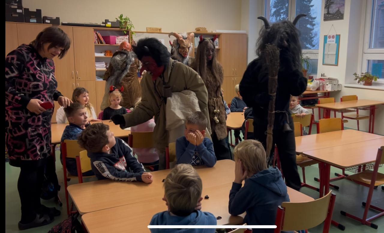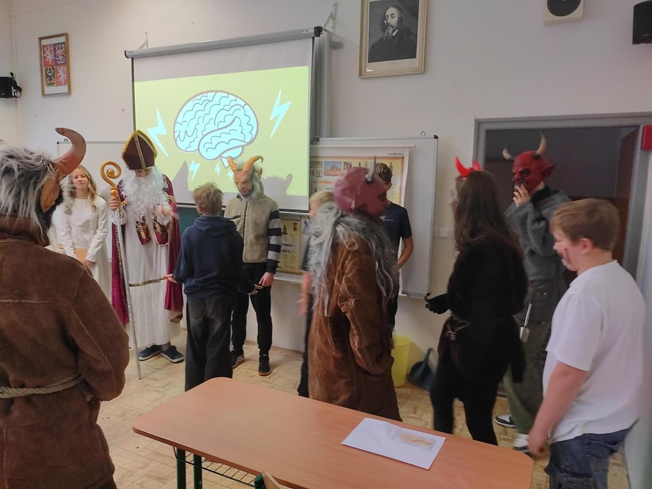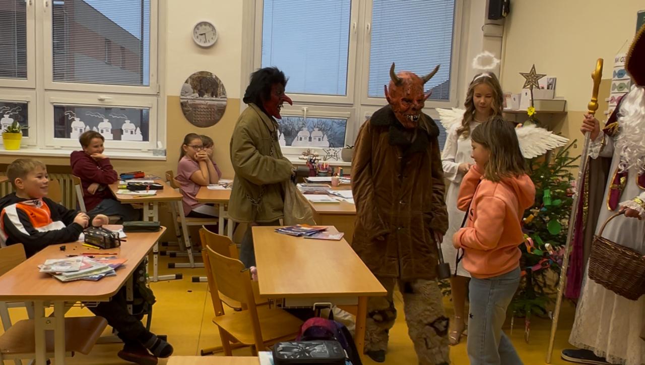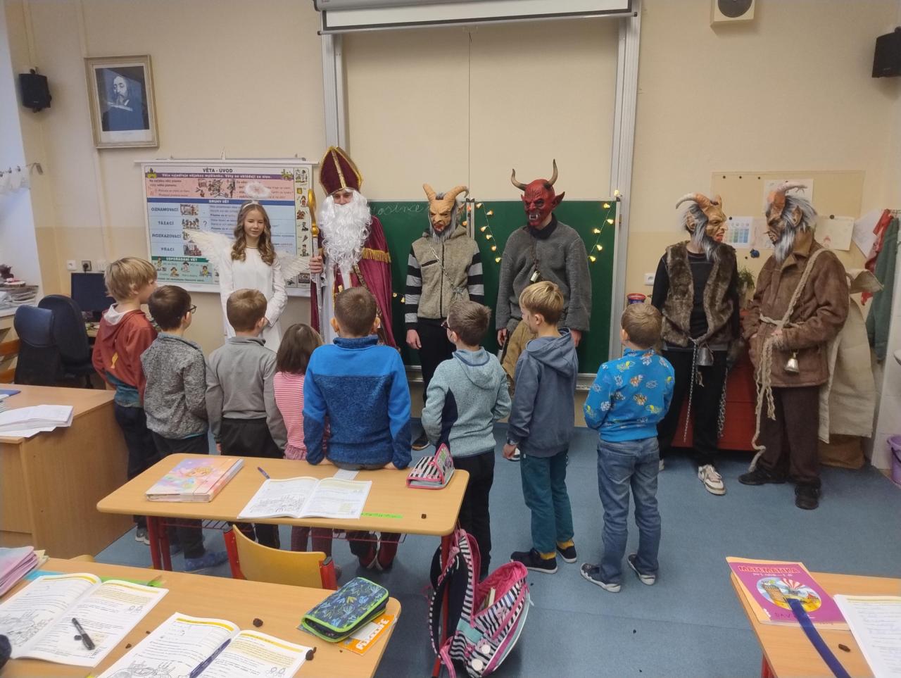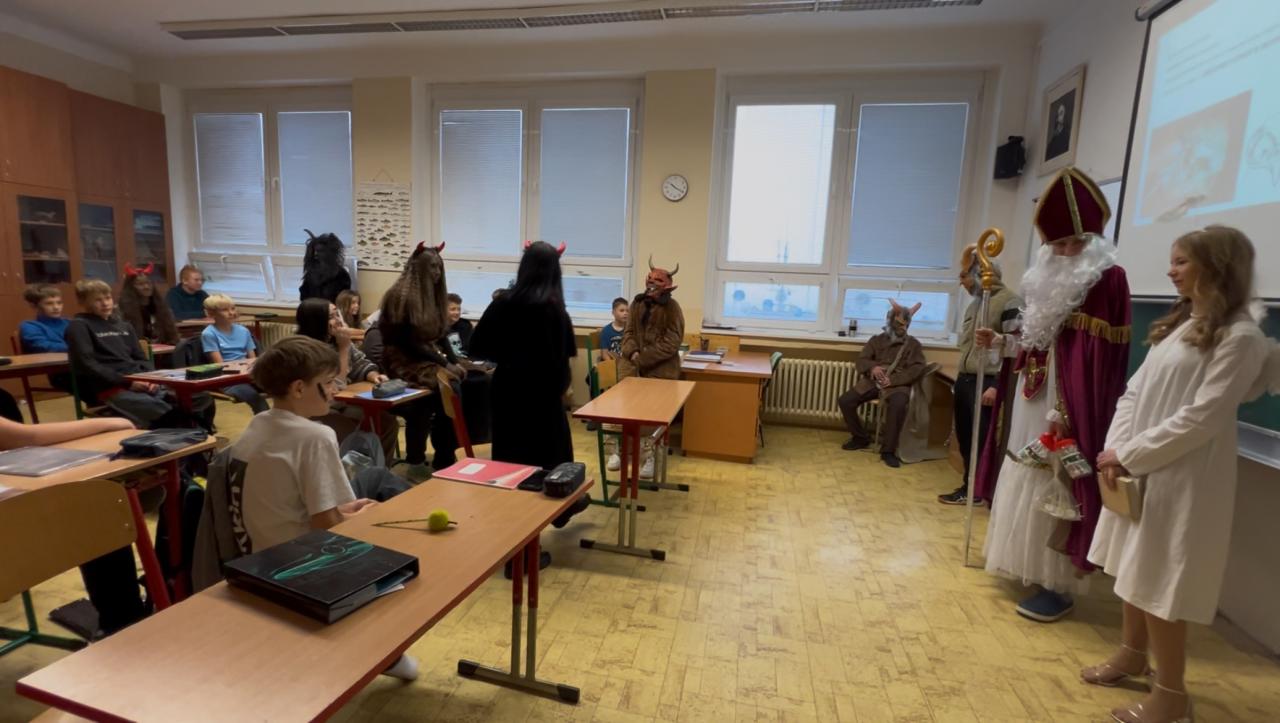Nejstarší deváťáci vyrazili v podobě Mikuláše, andělů a čertů na obchůzku po třídách. Hříšníky chtěli odnést do pekla, někdy se to téměř podařilo, ale většinou Mikuláš chválil a naděloval sladkosti. Deváťáci se zhostili této nepsané povinnosti na jedničku.